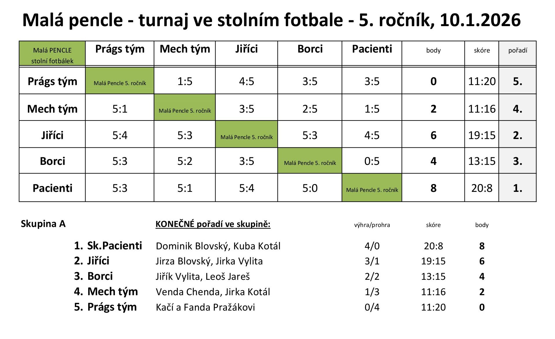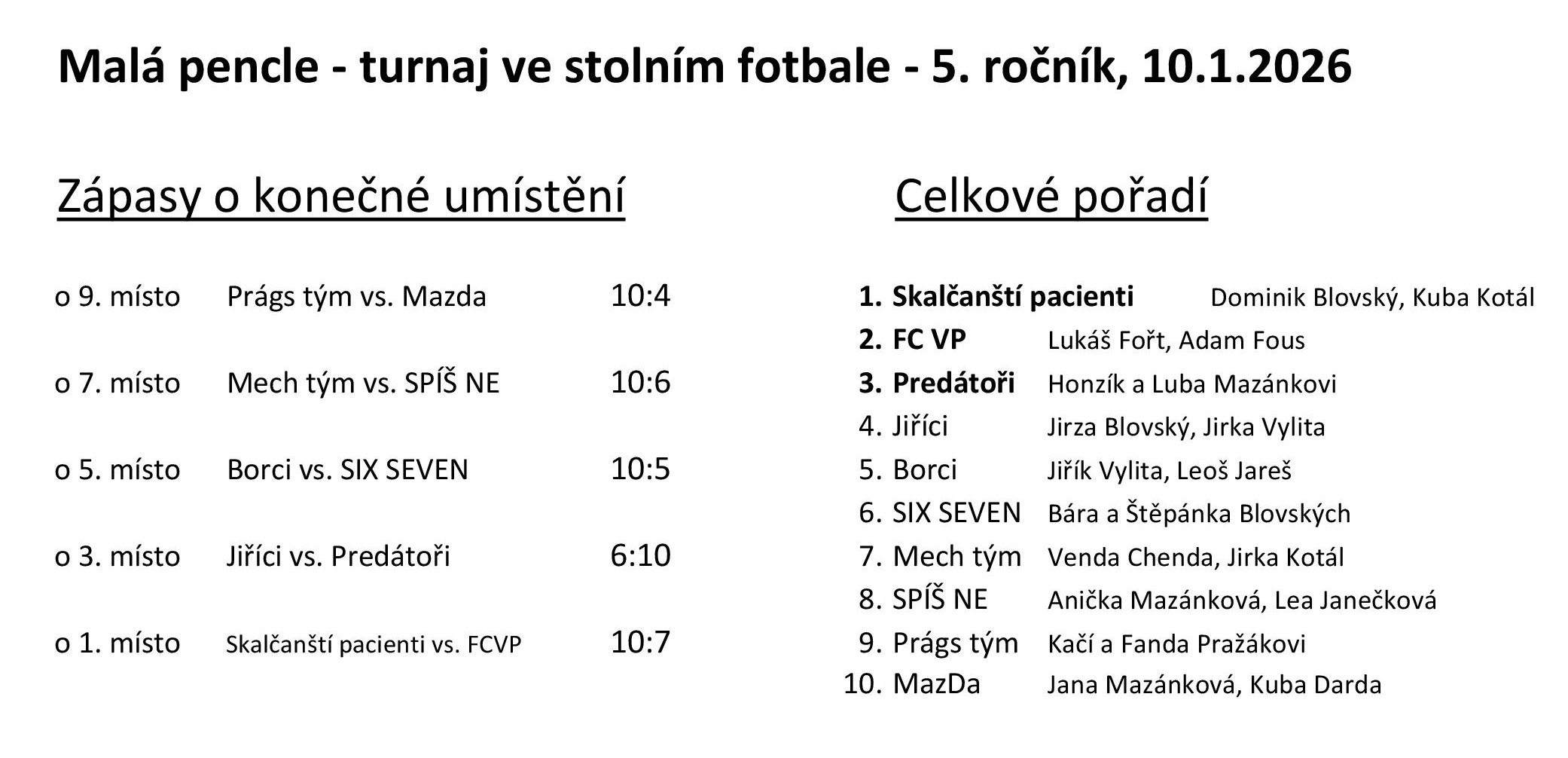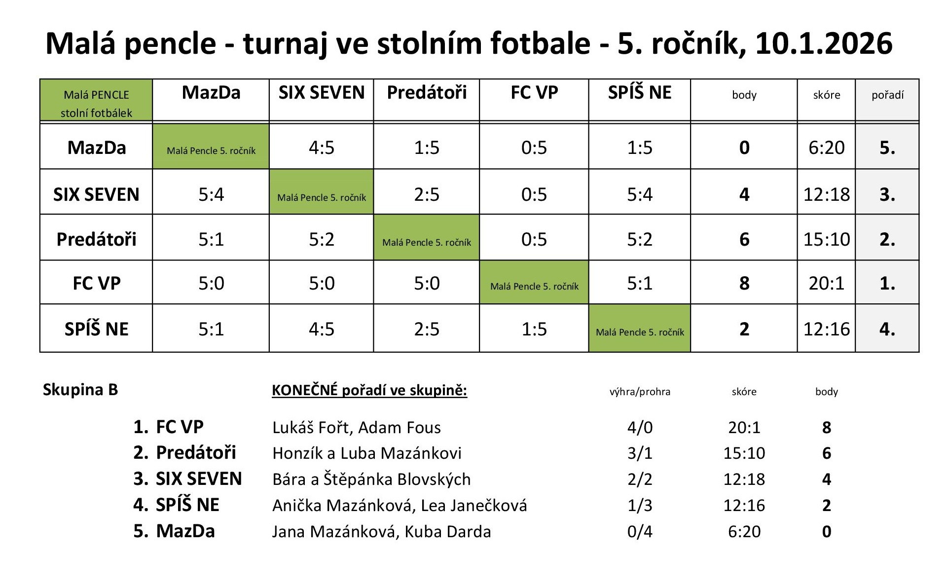 Miniturnaj ve stolním fotbálku Malá pencle 2026 má stejné vítěze jako v roce 2025, jen s jiným názvem týmu...