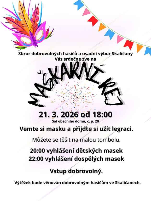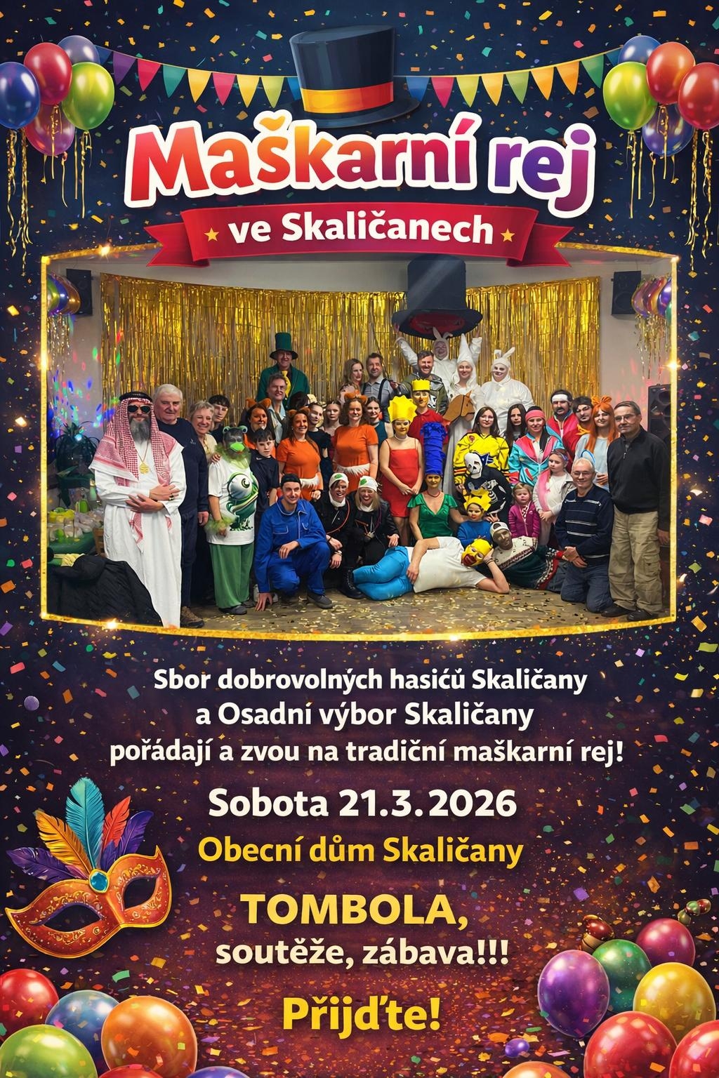 Sbor dobrovolných hasičů Skaličany zve širokou veřejnost na Maškarní rej 2026 - již v sobotu 21.3.2026 v sále obecního domu ve Skaličanech!!!